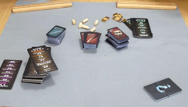 次に、「証拠カード」と「手段カード」を4枚ずつ配ります。赤のカードが「証拠カード」で青のカードが手段カードになります。それぞれ配り終えたら各々の前に並べて並べます。これで準備完了となります。