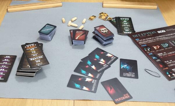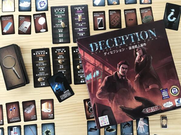 『Deception(ディセプション)-香港殺人事件-』は、JELLY JELLY GAMESから販売されているボードゲームで、捜査官チームと殺人犯チームに分かれて、法医学者のヒントから殺人犯の「殺害手段」と「証拠」を探し当てる正体隠匿系のボードゲームです。それぞれの配役によって勝利条件が分かれており、捜査官側は証拠カード、手段カード、場面タイルに置かれた弾丸マーカーの位置を元に犯人の証拠カードと手段カードを当てることを目指し、犯人側は当てられないように上手に意見表明を行い、捜査官に紛れて最終ラウンドが終わるまでやり過ごすことを目指します。