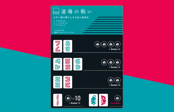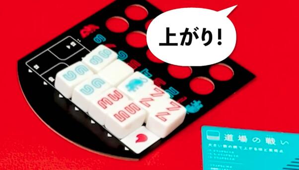 最終的に全ての手牌を個人ボードに置くことができたら「上がり」となります。上がった人は戦場カードを確認して上がり牌に応じた枚数の得点チップを獲得することができます。「1周ボーナス」を発生させていた場合は、裏面にした牌1つにつき得点チップを1枚追加で獲得することができます。1人が上がったらそのゲームは終了となり、次のゲームに移ります。これを繰り返しながら最終的に得点チップを10枚集めた人が勝者となります。